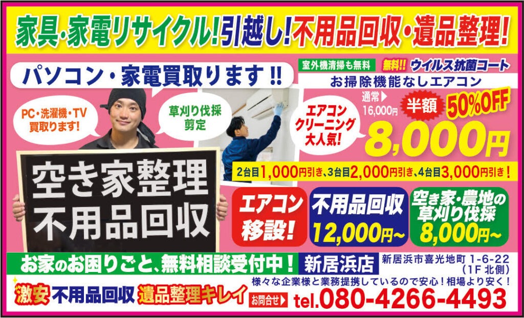 新居浜市の地元地域に根ざした企業として、新居浜市のお困りごとの解決や、草刈り・剪定・伐採から、エアコン、家電リサイクル、不用品片付けまで全てに対応しています!